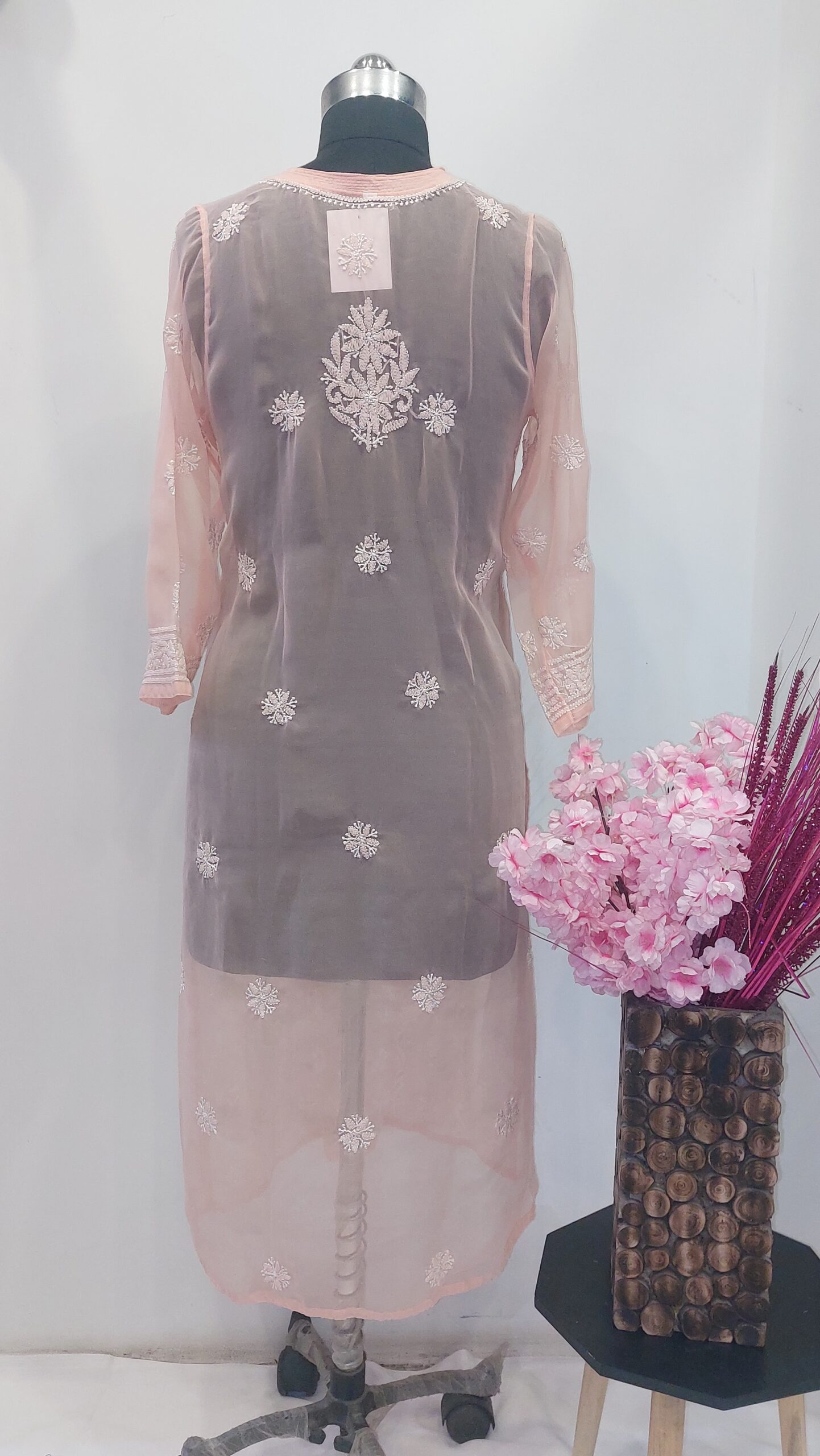 This Faux Georgette Lucknowi Chikankari Handwork Long Kurti blends intricate craftsmanship with a lightweight, flowy silhouette for all-day elegance.