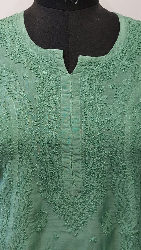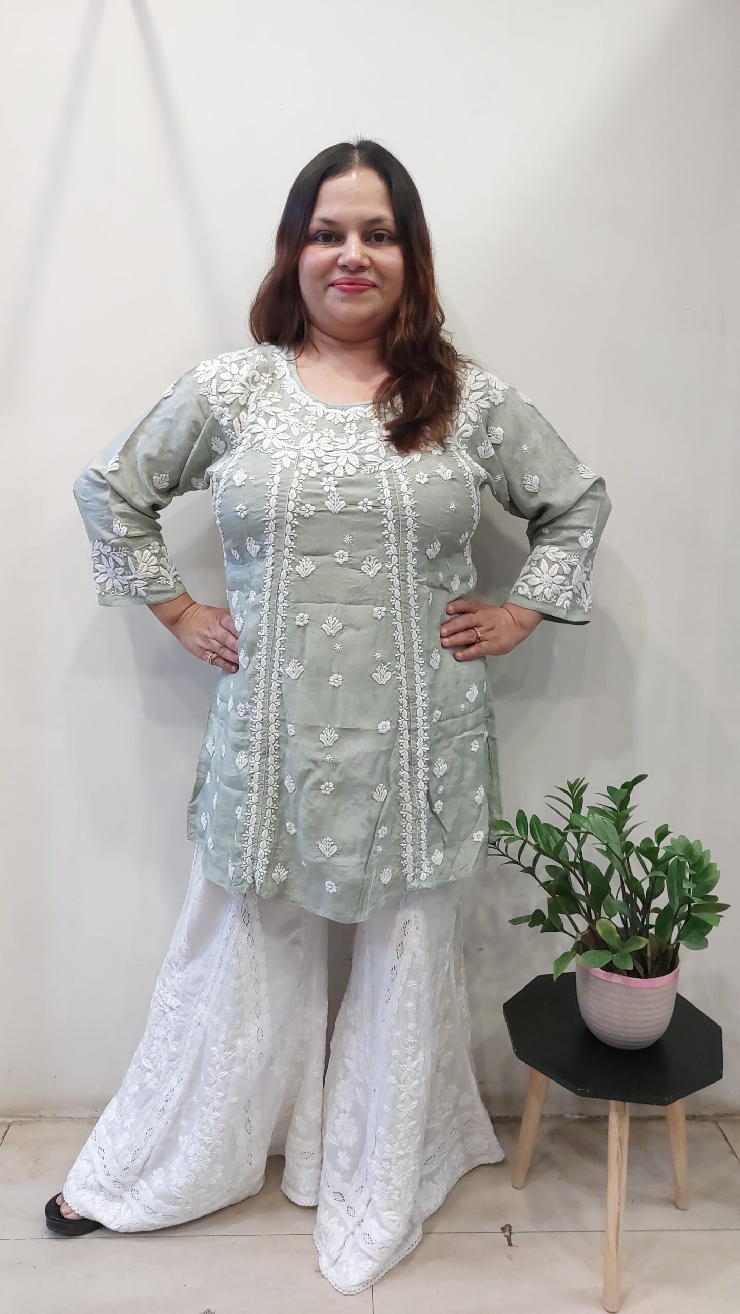 Elegant and timeless, this KAMALIKA Sage Green Premium Muslin A-Line Kurta Features delicate Lucknowi Chikankari hand embroidery with beautiful floral motifs and vertical detailing. Crafted in soft, breathable muslin, it offers comfort with refined traditional charm—perfect for effortless everyday elegance.