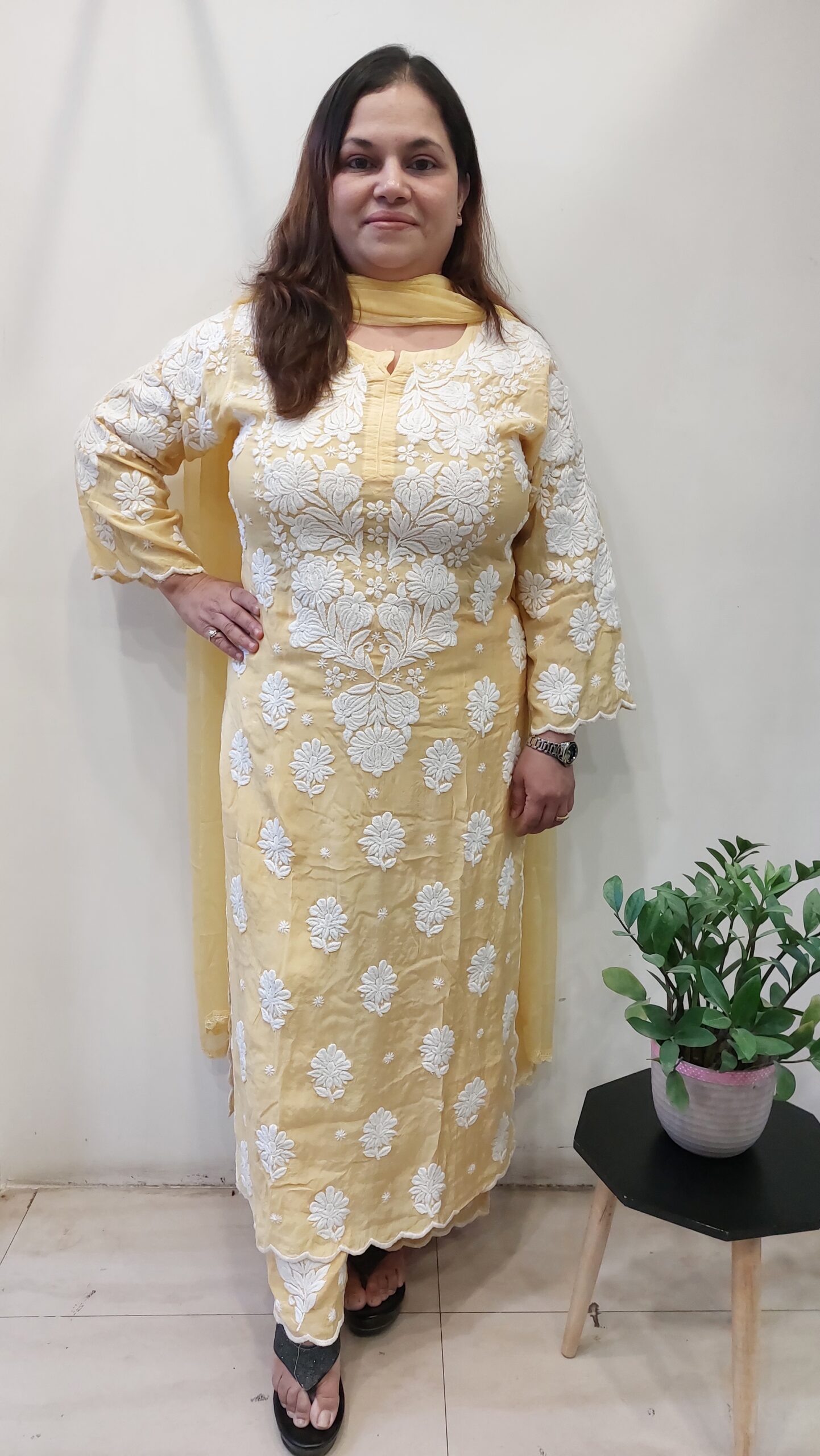 Elevate your ethnic wardrobe with this beautiful Hand Embroidered Lucknowi Chikankari Full 3-Piece Set In Premium Muslin Fabric crafted to reflect timeless grace and elegance.