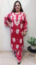 Elevate your everyday elegance with this stunning red Lucknowi Chikankari kurta set, crafted in luxurious premium muslin fabric. Adorned with intricate white hand-embroidered floral motifs, this piece beautifully blends timeless artistry with contemporary grace.