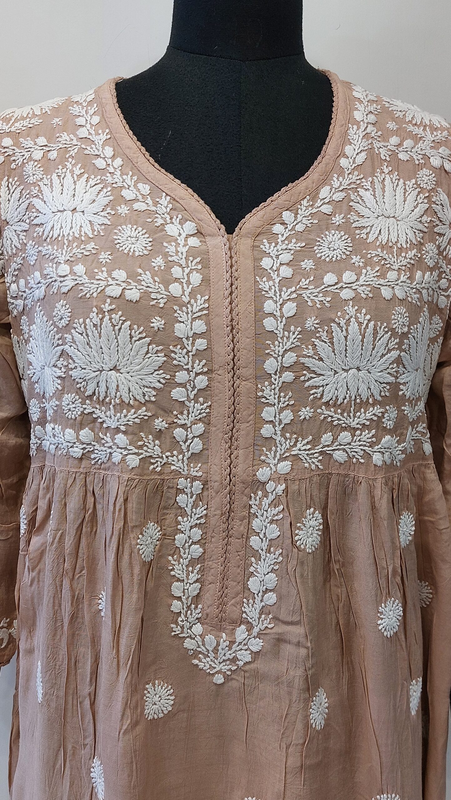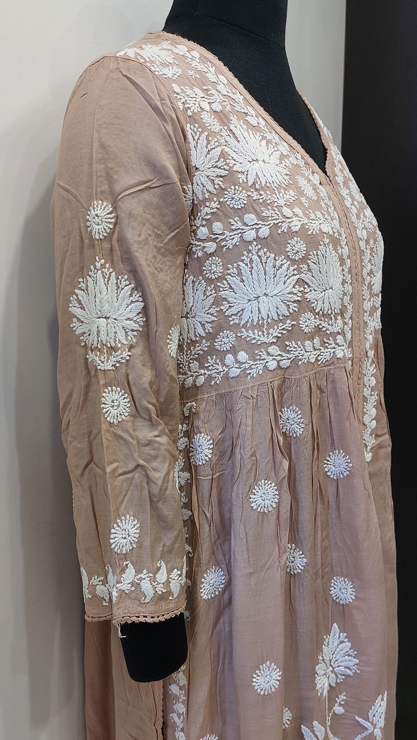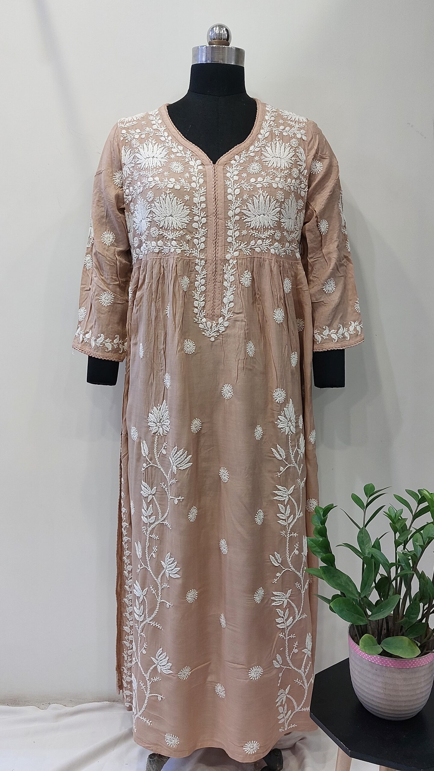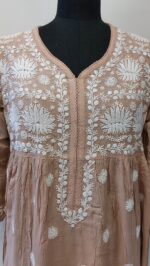 KAMALIKA Presents Elegant Muslin A-Line Kurta featuring delicate Lucknowi Chikankari hand embroidery, crafted in soft, breathable fabric for a graceful and comfortable look.