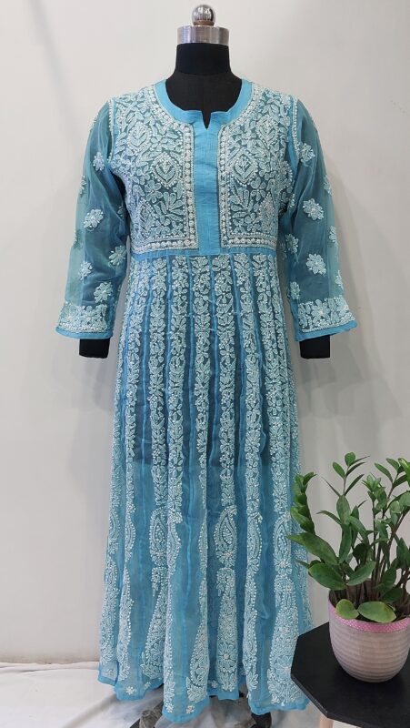 Delicate Hand Embroidery by Skilled Artisans of Lucknow Adorns the Flowing Silhouette, Creating a Perfect balance of Heritage Charm and Effortless Elegance. Lightweight, Breathable, & eautifully Flared, this Anarkali drapes gracefully, making it ideal for festive gatherings, intimate celebrations, and refined everyday wear. A Cassic piece that reflects the purity of craftsmanship and the beauty of traditional Indian handwork.